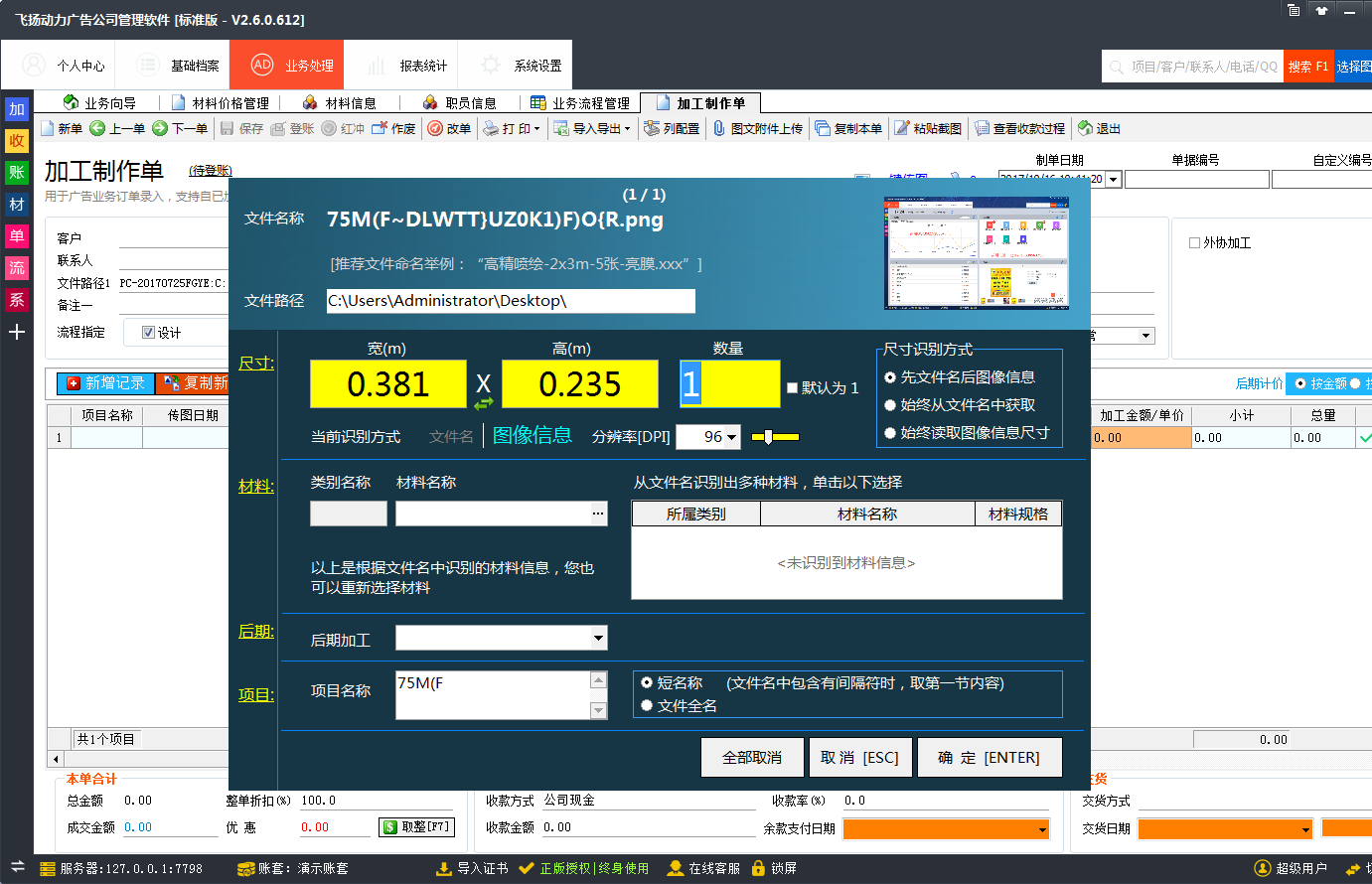 在飛揚(yáng)動(dòng)力噴繪管理軟件中,只需要把圖片直接拖入軟件,軟件就會(huì)自動(dòng)識(shí)別圖片的尺寸大小,圖片名稱的命名方式最好是按照我們軟件的要求:“畫面內(nèi)容-寬-高-材料-數(shù)量-白邊-后期加工”: