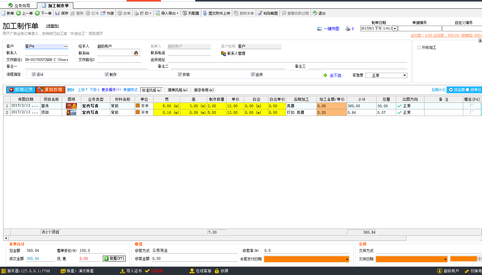 為廣告公司的業(yè)務員提供了快速開單的功能,拖動圖片到軟件,軟件可以自動識別圖片中的信息,包含項目名稱(制作內(nèi)容)、材料名稱、寬、高、制作數(shù)量以及后期加工等信息,材料單價此前已經(jīng)綁定,自動顯示,所以整張單據(jù)都不需要再手動去填寫相關(guān)的業(yè)務信息,廣告公司管理軟件就已經(jīng)自動開好單據(jù)。保存登賬計入財務。