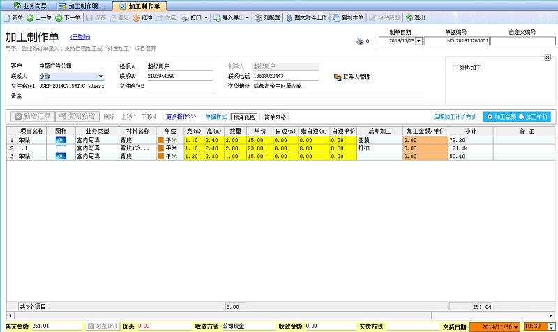 (1)在廣告公司管理系統(tǒng)中業(yè)務(wù)流程管理是十分清晰的,首先客戶下單后,就在軟件中開(kāi)出加工制作單,把客戶的加工制作要求都填寫(xiě)完整。(注:軟件是可以直接拖入圖片,軟件自動(dòng)識(shí)別尺寸,進(jìn)行快速開(kāi)單)