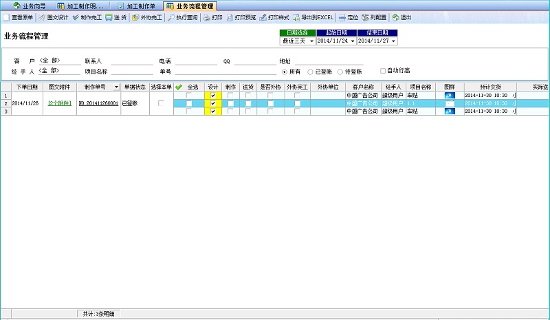 (2)在開(kāi)好加工制作單以后,在軟件的業(yè)務(wù)流程管理中就可以對(duì)目前單據(jù)的設(shè)計(jì)、制作、送貨安裝等流程進(jìn)行管理跟蹤了。同時(shí)圖文設(shè)計(jì)完成后,可以把設(shè)計(jì)好的圖片文件直接上傳到圖文附件中,便于制作人員下載進(jìn)行制作。制作完成就可以安排送貨安裝了。