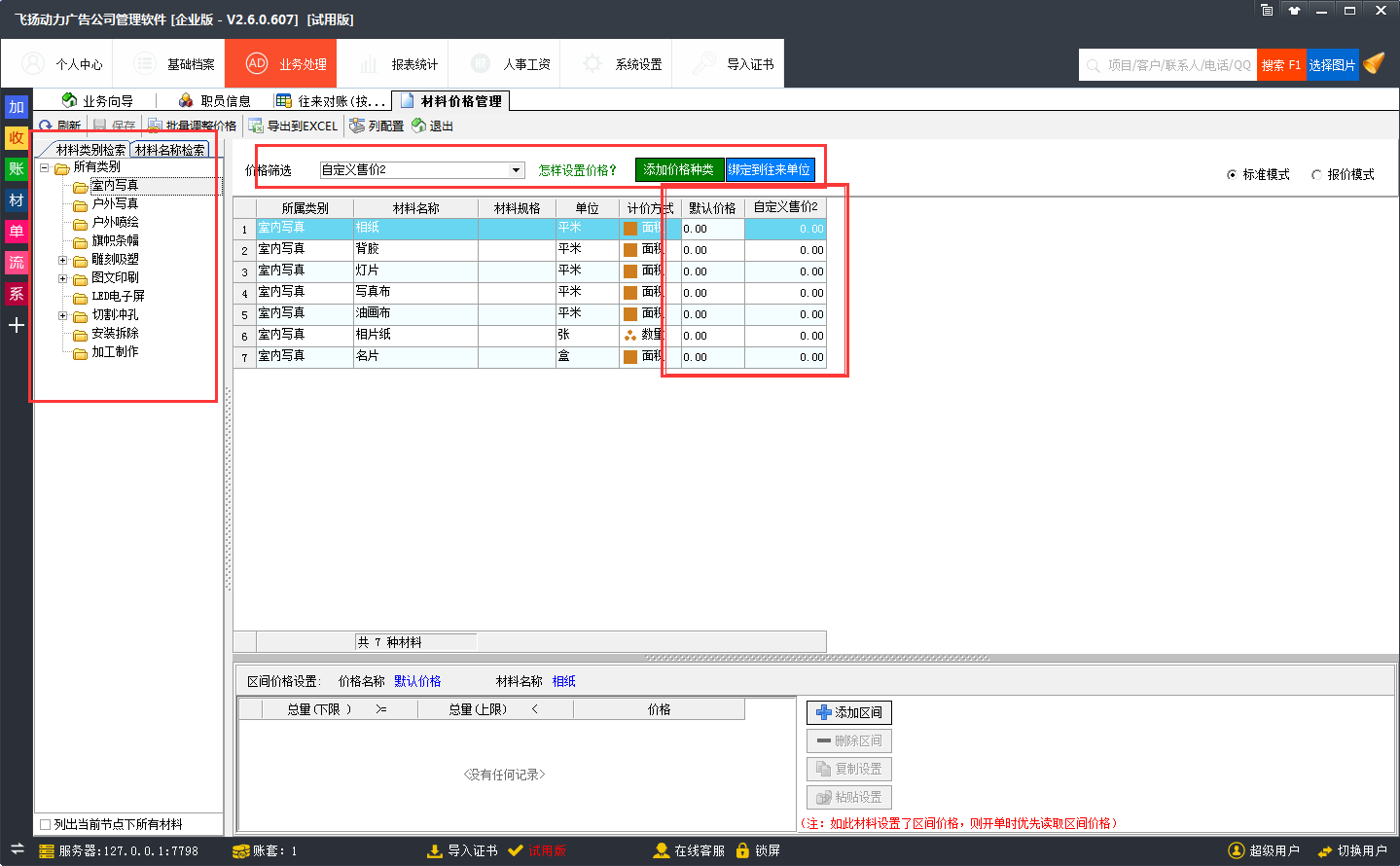 客戶價格綁定:飛揚動力廣告公司管理軟件可以針對不同的客戶設(shè)置不同的價格,比如,針對臨時客戶設(shè)置一套獨立的價格,只需要到材料價格管理中,添加一個臨時客戶的分類。然后,填寫對應(yīng)的臨時客戶的材料價格就可以了。