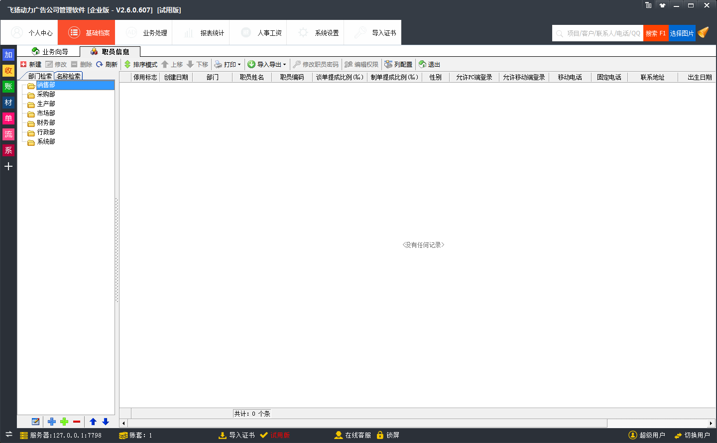 職員信息建立,飛揚動力廣告公司管理軟件可以新建多個員工的信息,讓自己的員工登陸到軟件中進行操作和使用。每個員工擁有一個獨立的賬號和密碼,每個員工都可以自己來獨立操作自己的部分業(yè)務(wù)。