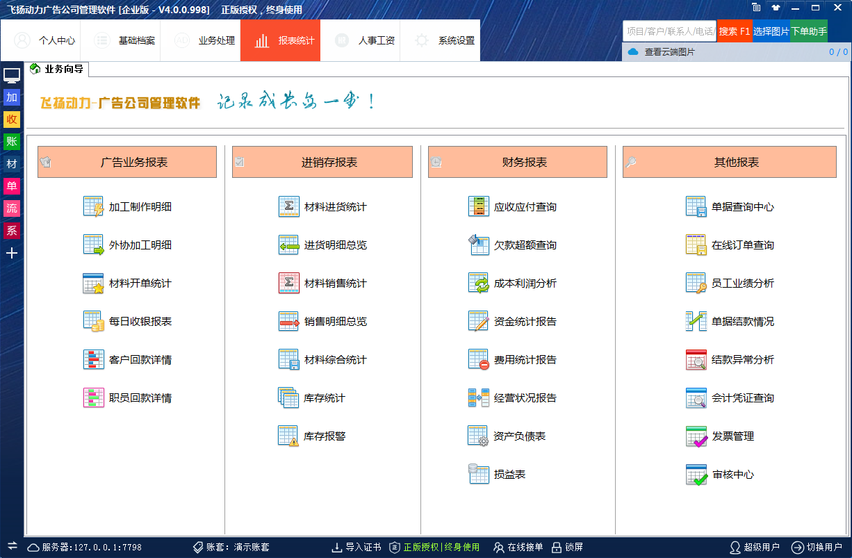 飛揚動力廣告公司管理軟件企業(yè)版集業(yè)務(wù)開單、外協(xié)加工管理、人事工資管理、業(yè)務(wù)流程管理、客戶管理、材料管理、往來策略(不同的客戶不同的價格)、業(yè)務(wù)單打印等多種管理功能為一體,適合中大型、連鎖型、集團型廣告制作企業(yè)。軟件通過將現(xiàn)代化企業(yè)管理理念同先進技術(shù)架構(gòu)相結(jié)合,打造一體化數(shù)字管理體系,幫助廣告企業(yè)提升工作效率,實現(xiàn)數(shù)字化運營,讓企業(yè)管理更加高效、便捷。軟件能規(guī)范業(yè)務(wù)訂單,減少錯單重噴降低材料消耗,提高生產(chǎn)效率,及時統(tǒng)計分析、財務(wù)盈虧狀況,是廣告制作公司提升核心競爭力的必備“武器”!